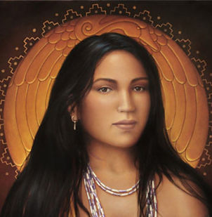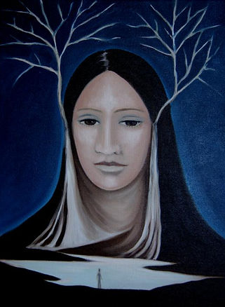 This painting of a Native American woman encompasses the empathy, mystery, wisdom, identity, strength, and pride in her knowledge and heritage that Aunt Moon has in Linda Hogan's "Aunt Moon." The painting additionally has an ethereal quality that hearkens back to Hogan's subtle discussion of spirituality in her work.